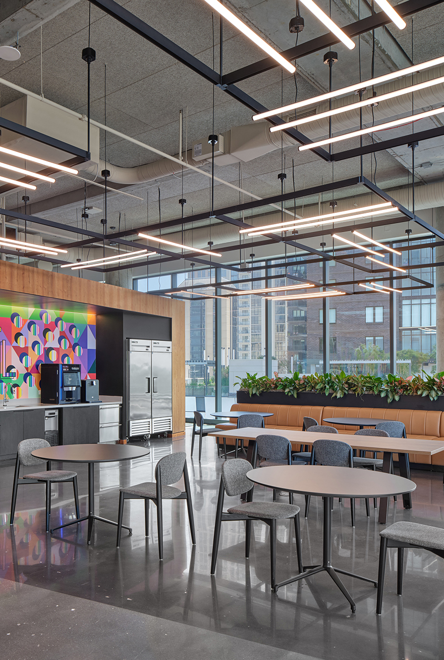 Sustainability and coordination were central to the project’s success. A significant portion of existing workstations and ancillary furnishings were reused to support LEED certification goals, requiring detailed documentation and close collaboration across teams. Working in partnership with Leapley, the general contractor, installation sequencing was carefully coordinated, including the early installation of modular phone booths to accommodate safety requirements. Through clear communication and teamwork among all project partners, reused and new elements were seamlessly integrated to deliver a flexible, future-ready workplace.